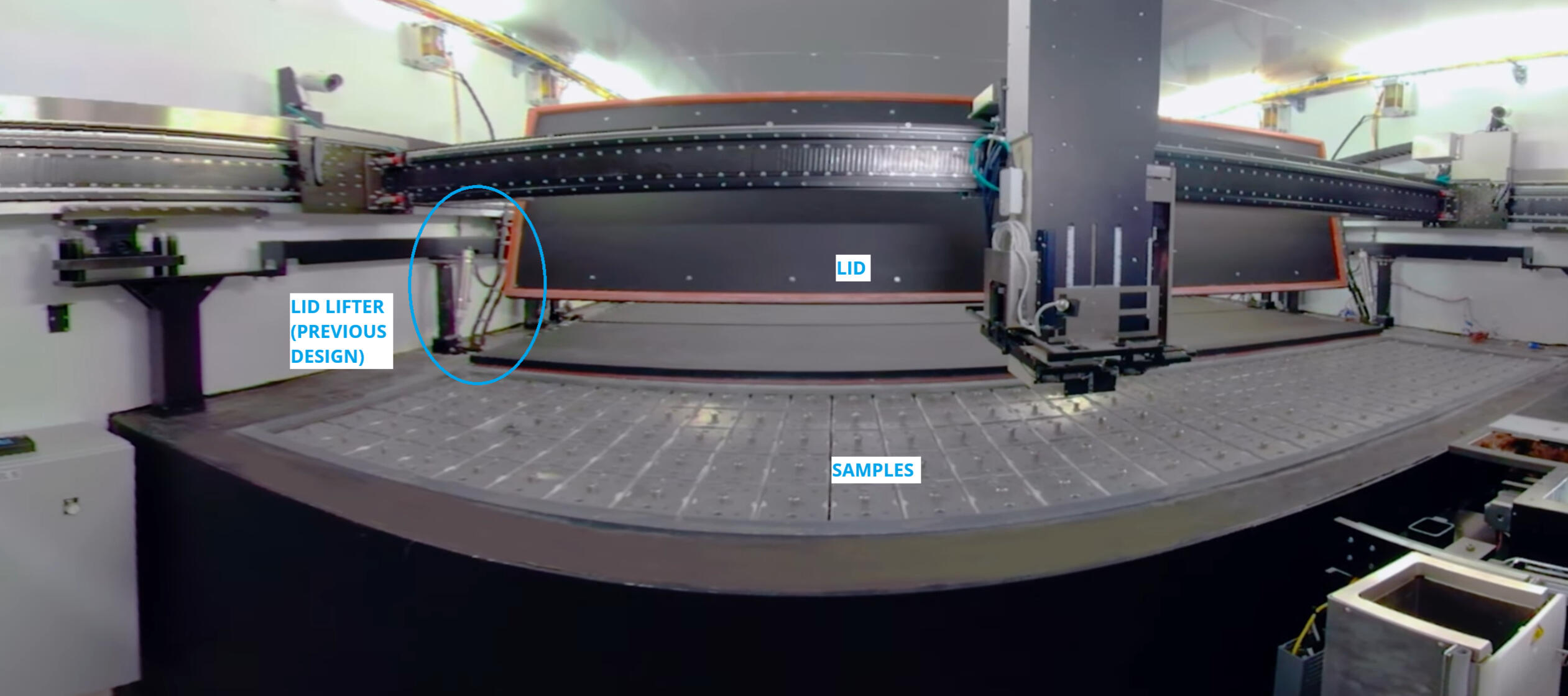 I redesigned the lid lifters that keep samples secure in the BiOS. This project had a couple design constraints: it had to be retrofittable, and it had to use a specific linear actuator. I created a simple, reliable assembly with ambidextrous parts that allowed left- and right-handed assemblies to use the exact same BOM. My electro-mechanical lid lifter saved days of install time by replacing an older design.During the ideation process, I experimented with hinge designs before arriving at my simplified final design. I enjoyed learning about kinematic synthesis and linkages during this project.